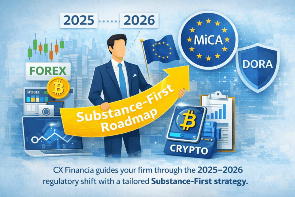 Don’t navigate the 2025-2026 regulatory shift alone. Whether you are launching a new Forex brokerage or expanding your Investment Firm’s scope to include Crypto-Assets under MiCA, CX Financia provides the “Substance-First” roadmap you need for a 100% successful activation.